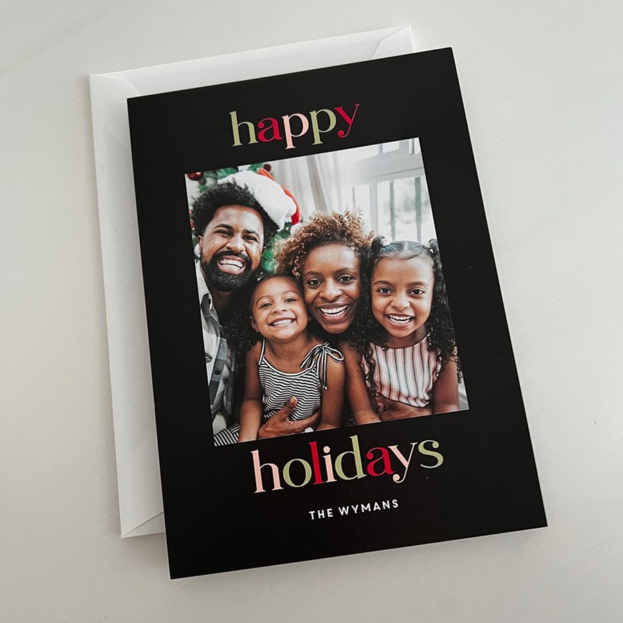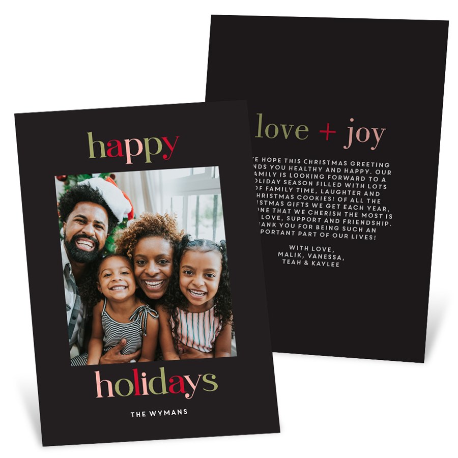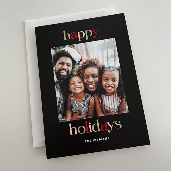 This Christmas, send a bright and festive holiday card with this Bright Statement Christmas Card featuring your favorite photo. The front of the card features the phrase “happy holidays” in festive colors along with your custom wording. You may change the background color and editable text colors on this fun and cheerful design. Personalize this holiday card, and create a custom look with endless layout, photo, design and text options.