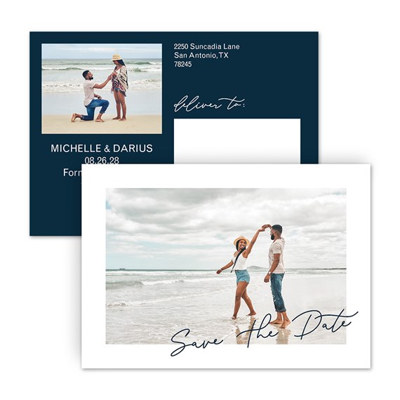This simple, Angled Type save the date postcard has tons of style packed into an affordable card. The phrase "Save the Date" is printed across your photo in the colors of your choice. You can move the placement of the wording to fit your card best. The editable text can be changed to the wording you'd like in any font and color. Remember to use postcard-rate stamps to save on postage!