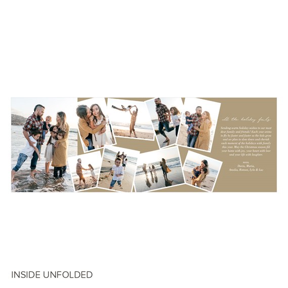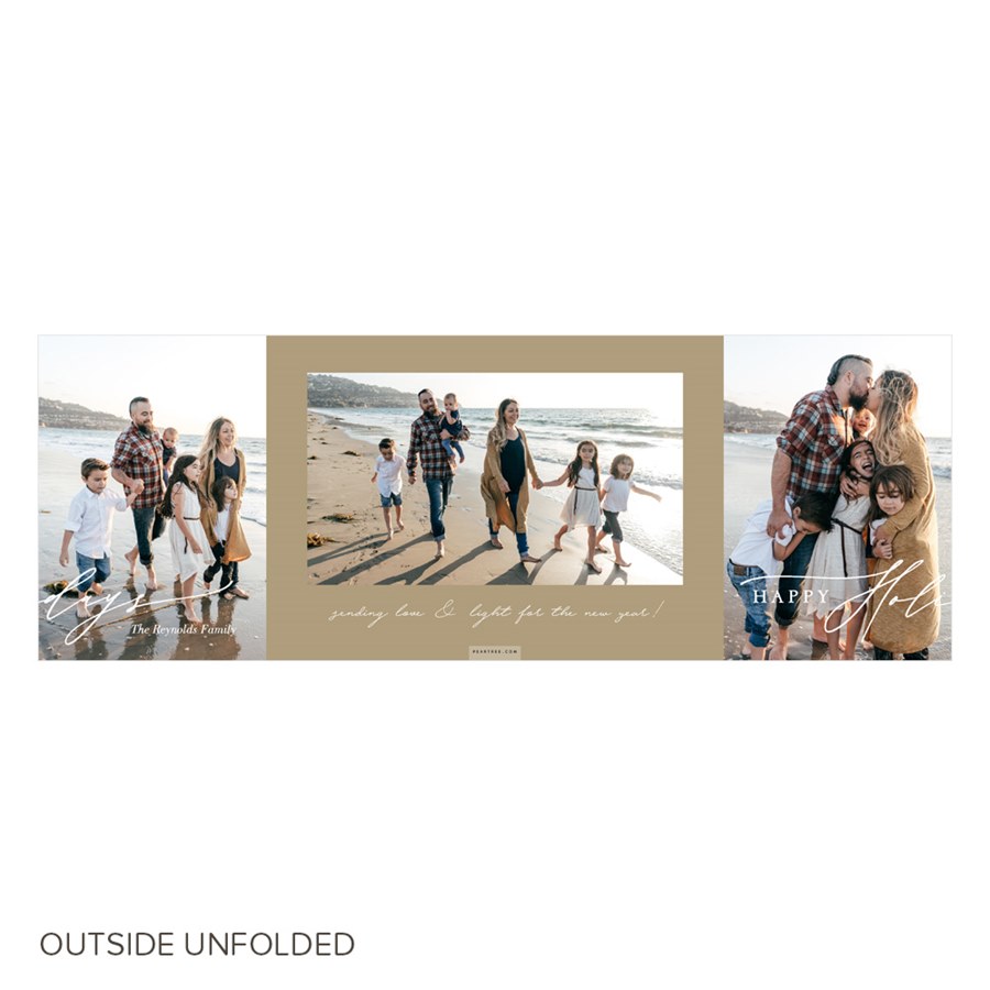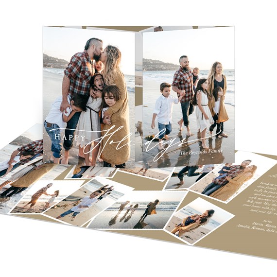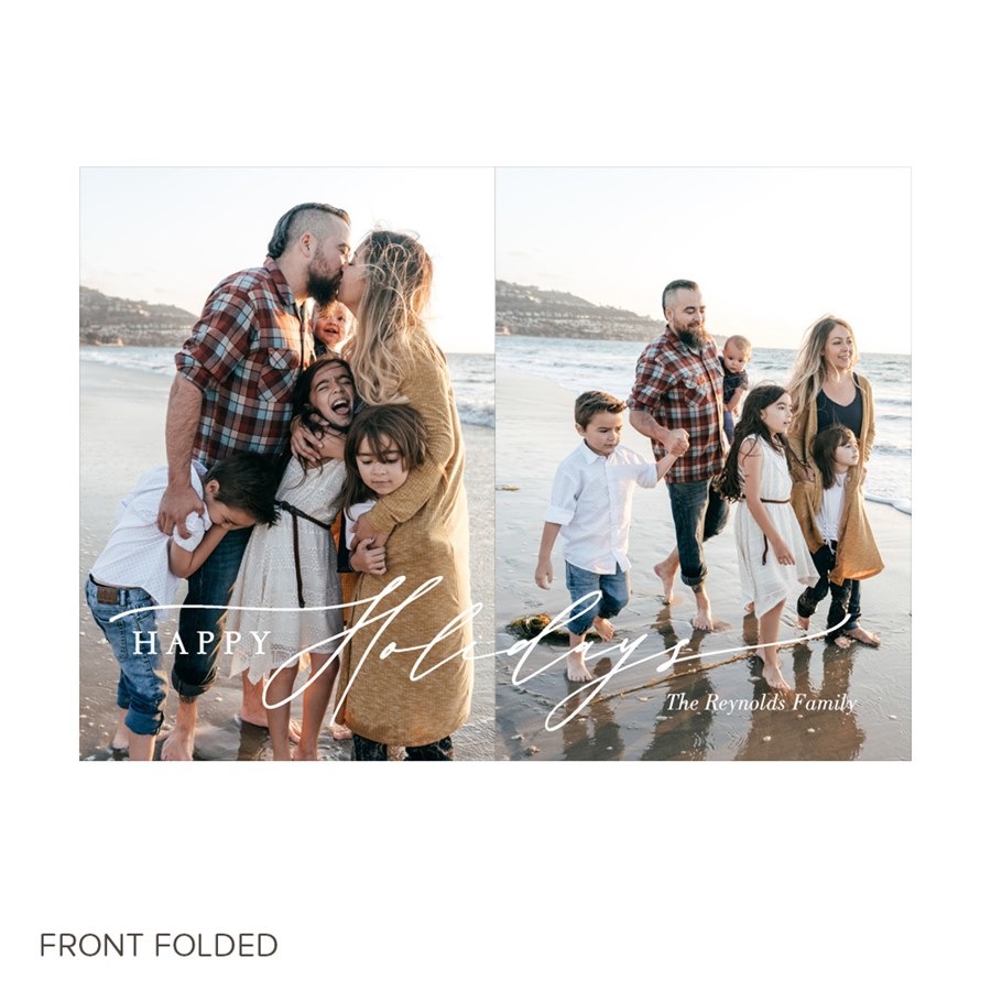 Stunning and totally unique, this gatefold Minimalist Holiday Christmas card features all your favorite photos. The phrase, "Happy Holidays" is printed across the front panels. You can update the color of the wording to anything you choose. This folded photo card holds lots of family snapshots and your own custom holiday letter. You can change the entire color palette, plus the editable fonts, to suit your family's style.