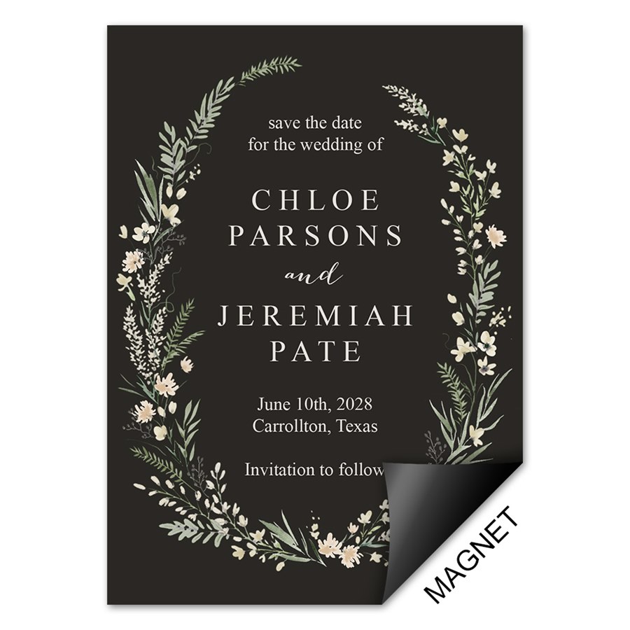 This Wildflower Frame Save the Date Magnet features dainty cream wildflowers that surround your wording beautifully. It can be customized in any color background with the fonts and wording of your choice.