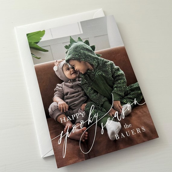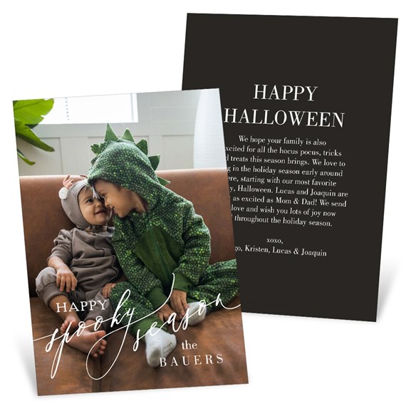 This year, send a stylish Halloween card that shares your favorite Halloween photo and a spooky sentiment with this Happy and Spooky Halloween Card. The words "Happy Spooky Season" are printed on the front in the color of your choice. You can move the placement of the wording to fit your card best. On the back, you can choose no photo, one photo or multiple photos and you can choose from a variety of colors for the background. All text is editable on the back with choice of fonts and colors.