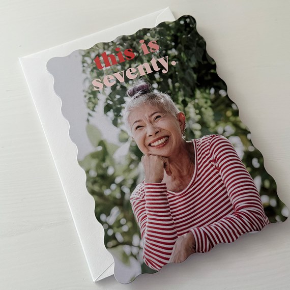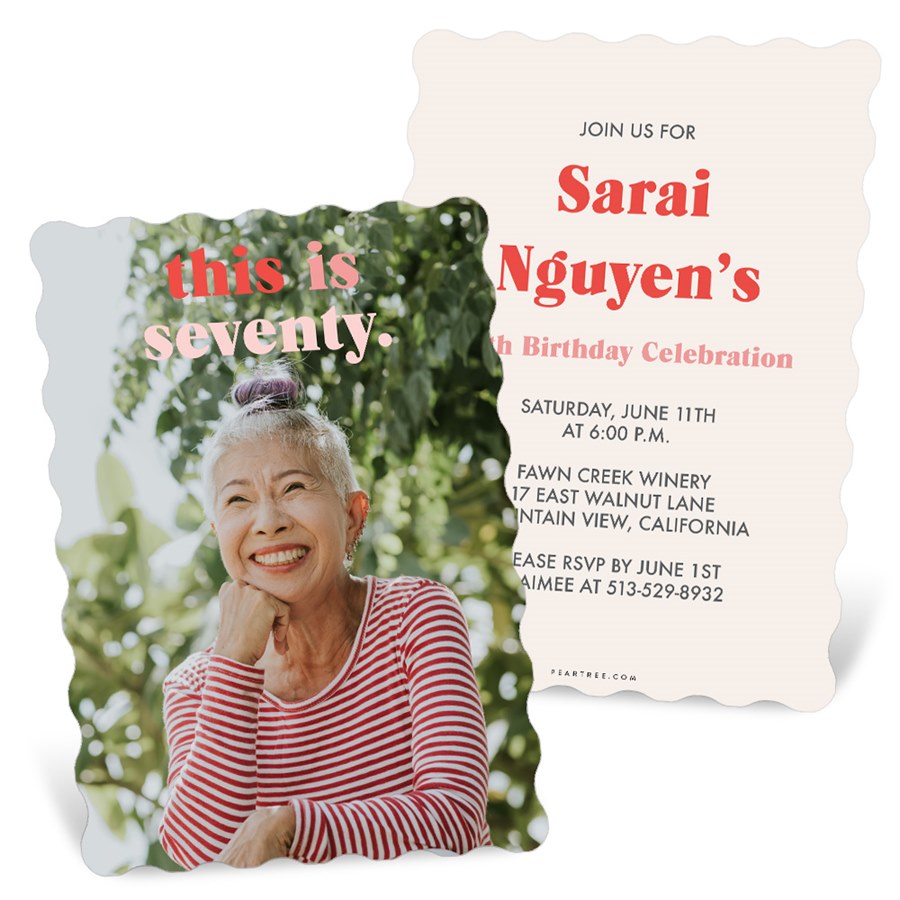 This Modern Age photo birthday party invitation features scalloped edges for a fun touch to send to your family and friends. The front features your photo and custom text. You may update all the fonts and colors to create a design you love.