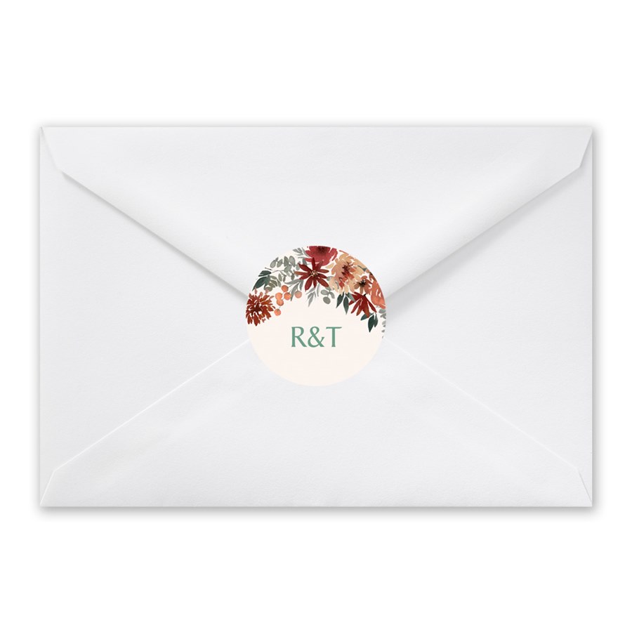 Add some extra style to your save the dates, wedding invites or even your rehearsal dinner invitations with these Autumn Blooms envelope seals. Blossoms in burgundy, orange and green mix together in perfect harmony. You may update the background and text color to create a custom seal for your wedding stationery.