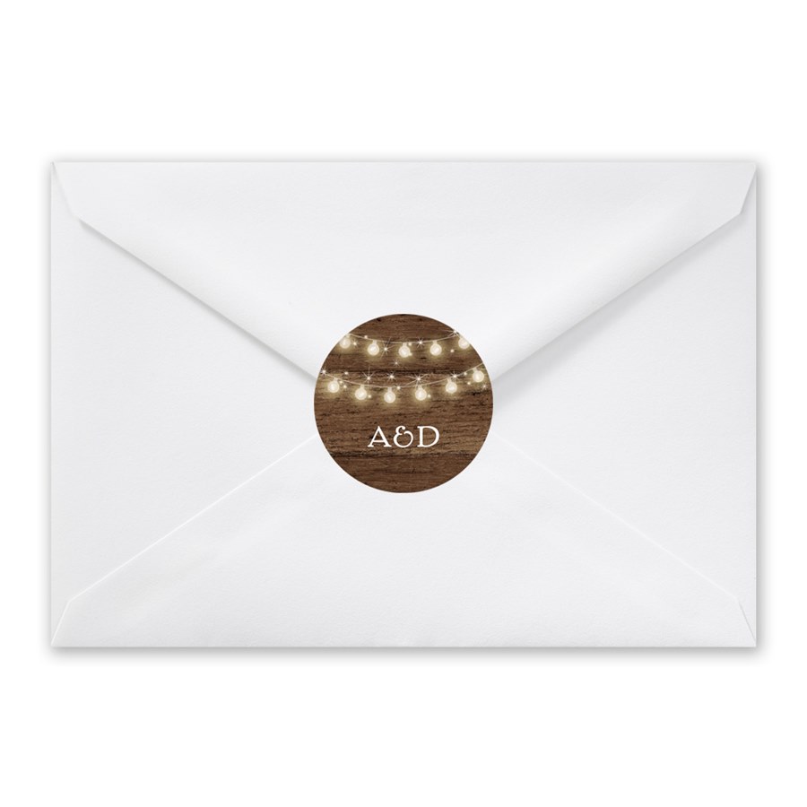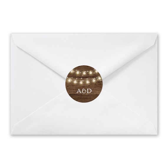 Dress up your save the dates, wedding invites or even your rehearsal dinner invitations with these Aglow envelope seals! Your initials are printed on a woodgrain background. The cute string of lights practically glow on these fun adhesive seals.