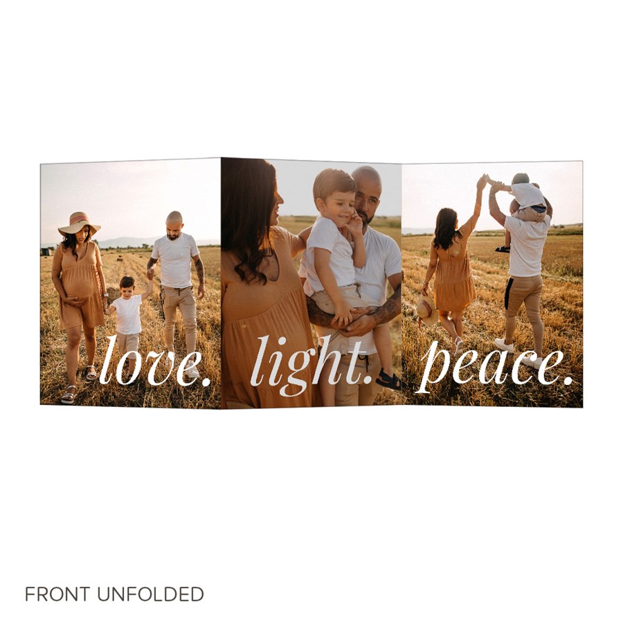 Spread love, light and peace in a bold and beautiful way this Hanukkah season. This Love and Peace Hanukkah card on the front features 3 of your favorite photos and the words, "love. light. peace." featured on the front in your choice of colors. You can move the placement of the wording to fit your card best. Personalize this photo Hanukkah card, and create a totally personalized look with endless color, photo, design and text options.