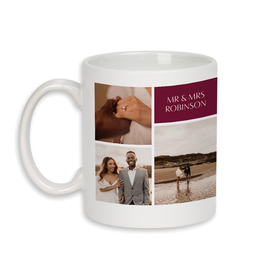 Celebrate your “just married” status in style with this personalized Newlyweds Ceramic Mug! Whether it’s sipping morning coffee or enjoying a cozy tea break, this custom coffee mug for newlyweds is a perfect way to relive your special day every day. Add your new married name or wedding date in the custom text boxes, and upload 7 of your favorite wedding photos to make this just married mug uniquely yours.