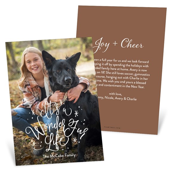 This holiday, send this WonderFUR Life Christmas card that shares the furry members of your family. The phrase “It's a WonderFurl Life" plus your custom wording and photo are featured on the front. You may move the placement of the wording to fit your photo best. Personalize this photo Christmas card, and create a custom look with endless layout, photo, design and text options.