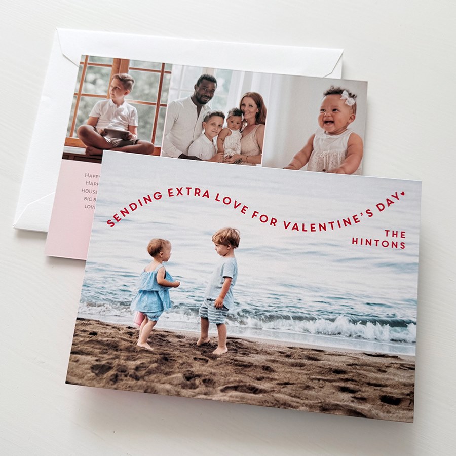 This Valentine's Day, send a cute and festive Curved Message Valentine's Day Card with your favorite photo. The front of the card features the phrase “Sending Extra Love for Valentine's Day” along with your custom wording. You may move the placement of the wording to fit your photo best. You may change all the colors on this fun and cheerful design. Personalize this Valentine's Day card, and create a custom look with endless layout, photo, design and text options.