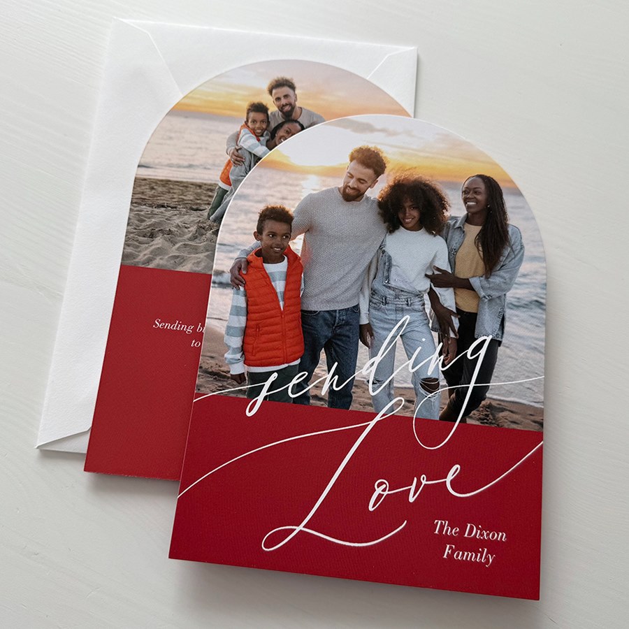 This Sending Our Love photo Valentine's Day Card features an on-trend arch shape paired with classic style. The front features your photo and the phrase "Sending Love." You can move the placement of the wording to fit your card best. You may update all the colors to create a design you love. Personalize this photo Valentine's Day card, and create a custom look with endless layout, photo, design and text options.