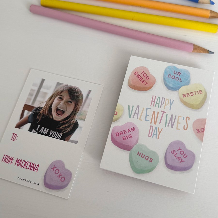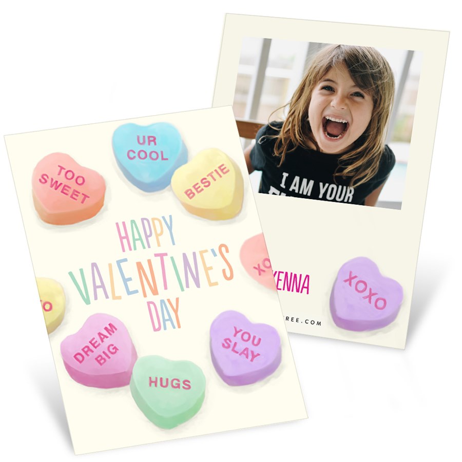 Wish everyone the sweetest Valentine's Day with these Candy Hearts Classroom Valentine's Cards. Perfect for handing out at school, these mini cards are bursting with cheerful style! The front is printed as shown with a fun rainbow design and the phrase "Happy Valentine's Day" and classic conversation heart candies. Personalize the backside with a photo and custom text till it's perfect for your little cupid.