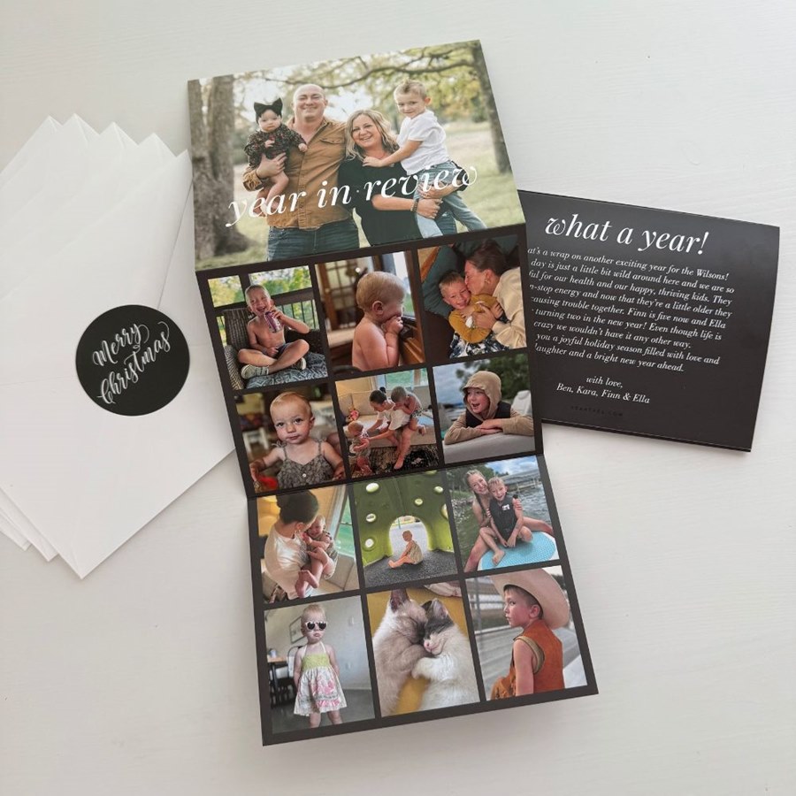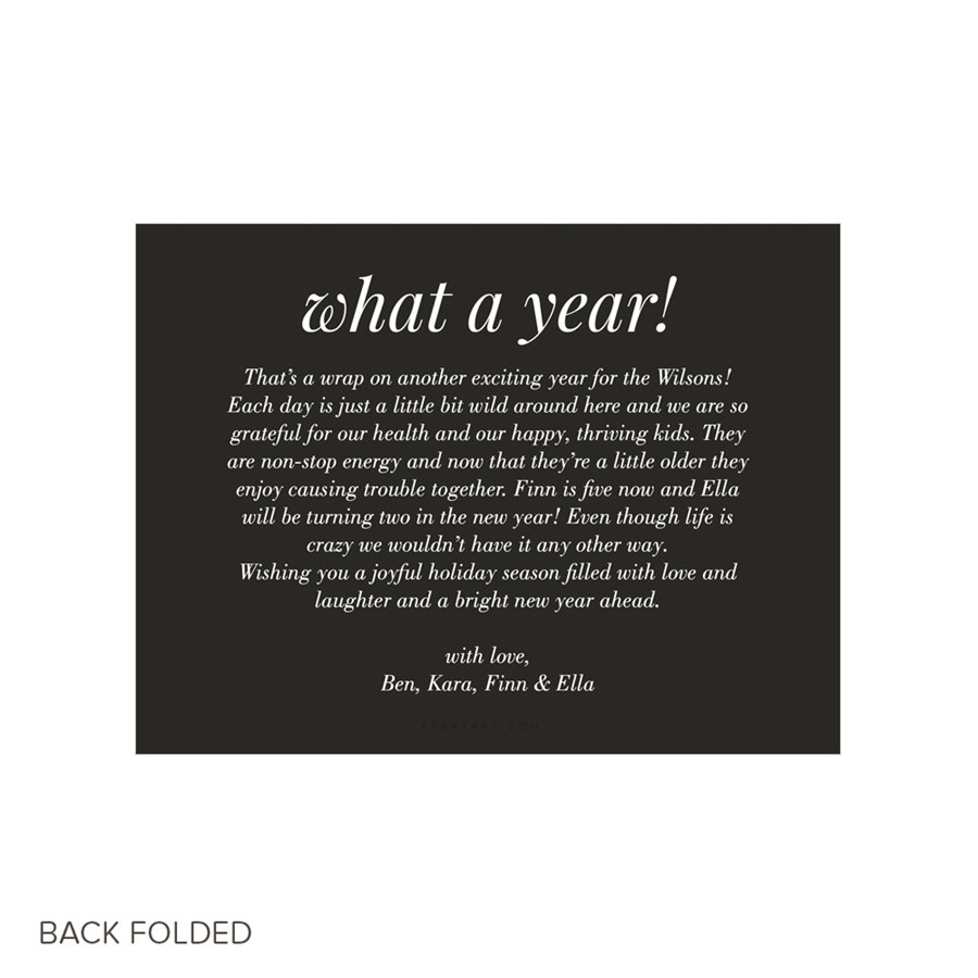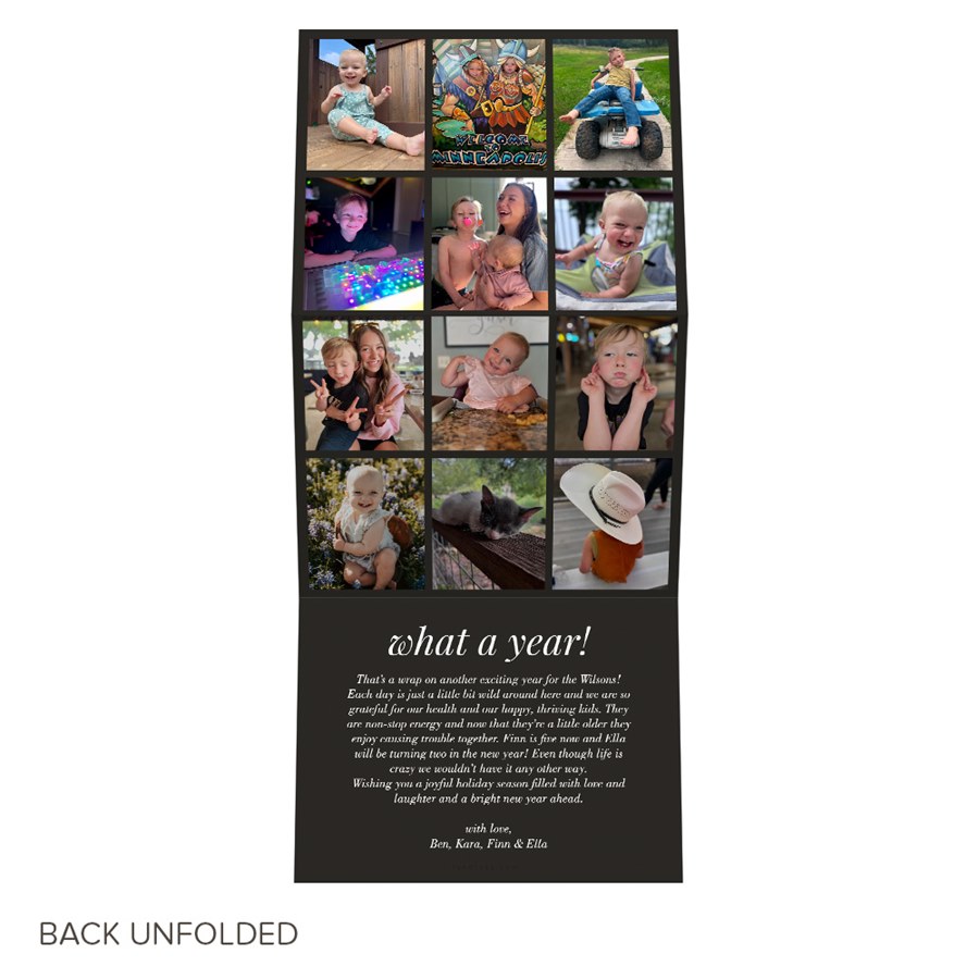 Show off your beautiful family snapshots with The Best Year Christmas Card. Anyone having trouble choosing which awesome snapshots to share this holiday season should check out this holiday card with room for an incredible 25 photos! The top photo in this vertical tri-fold card can feature your choice of text as shown. On the back, your Christmas message appears at the bottom against your choice of background color. Text is editable with choice of fonts and colors.