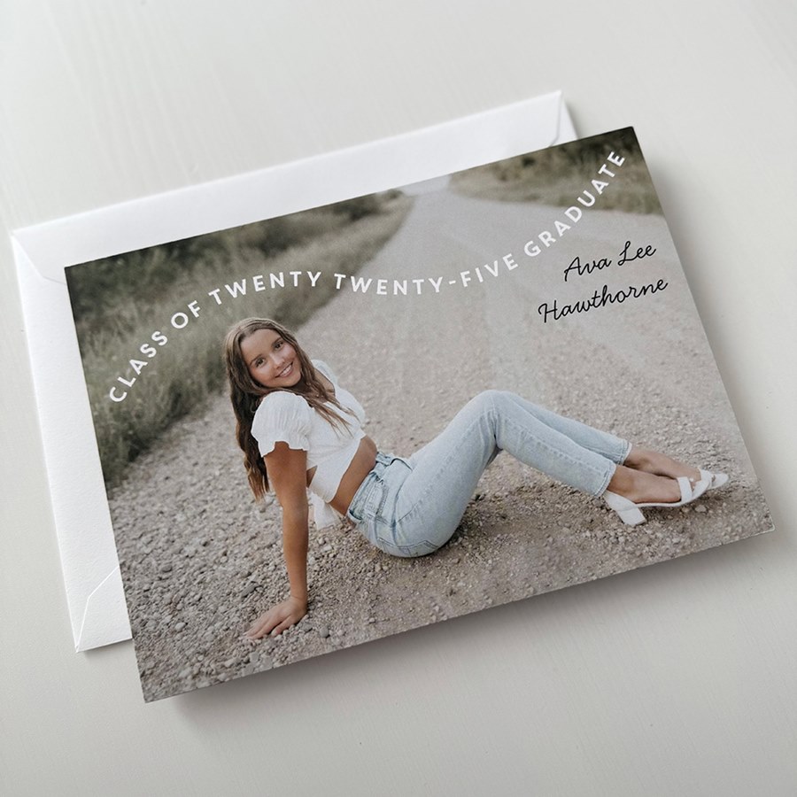 Send a cute and stylish Graduate Curve Graduation Invitation with your favorite photo. The front of the card features their graduation year written out in a wavy line, along with your custom wording. You may move the placement of the wording to fit your photo best. All the wording, colors and fonts on this classic announcement can be customized to suit your style. With endless layout, color and photo options, this announcement can be customized to suit your personal style, and can also double as your Graduation Announcement.