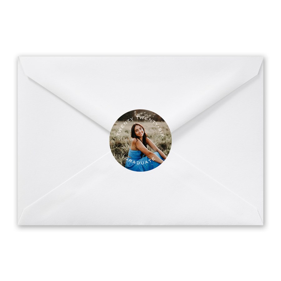 These Minimal Type personalized seals can be used to add personality to your graduation announcement envelopes, party decorations, wherever you need a spot of color or charm. Their graduation year and the word "graduate" are printed over your favorite photo in the color of your choice. Use them to seal your envelopes or even use them on party favors, paper cups, table cards or serving dishes, or you can stick two together over a toothpick or wooden skewer to create cupcake toppers! These 2" diameter circles come in sheets of 20 adhesive-backed seals per sheet.