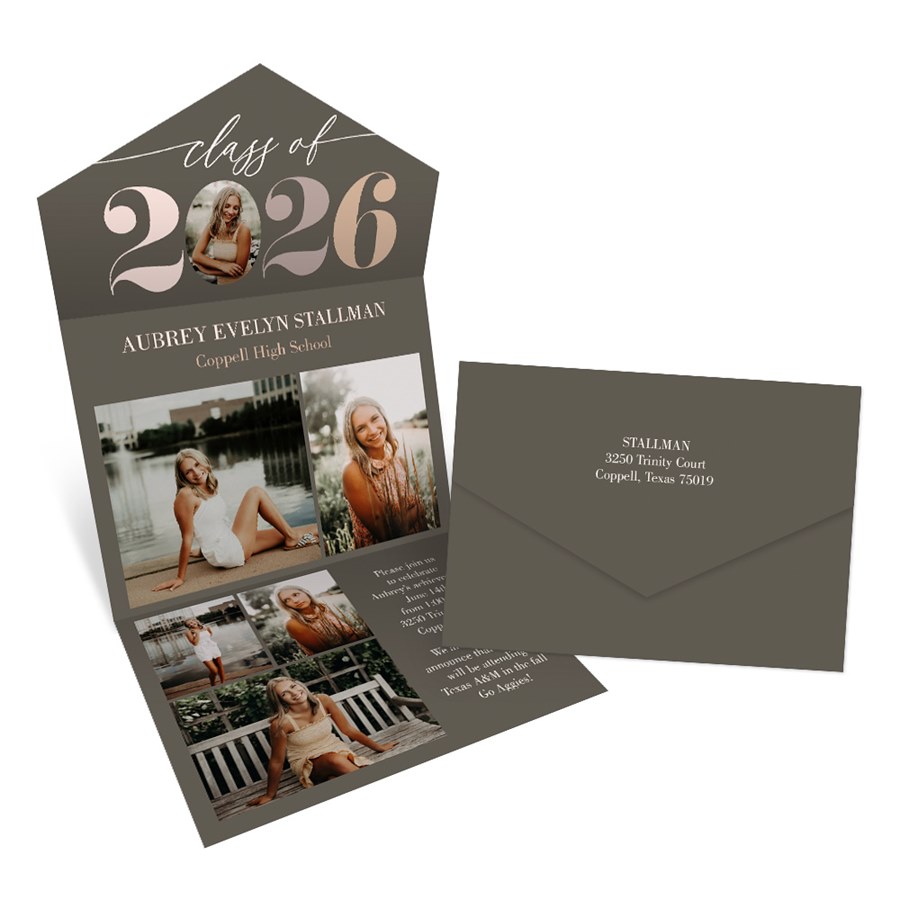 This Bright Year Graduation Announcement includes your custom graduation details and favorite photos. Seal and Sends are self-mailing – no need for envelopes! Simply fold, secure it with clear seals (included) and drop it in the mail. This colorful design features their graduation year with the first zero as a photo frame for one of your favorite photos. Customize all your announcement wording and add an additional 5 photos. You may update all the colors to create a design you love.
