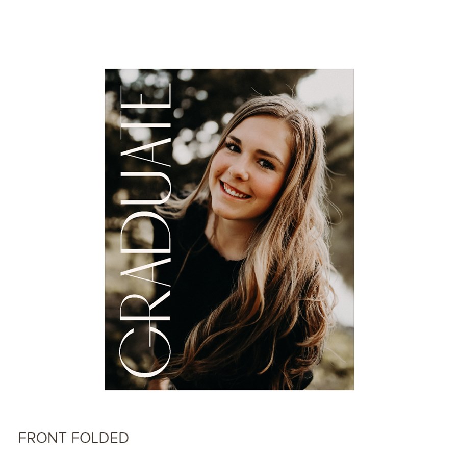 This Upward, folding graduation party invitation lets you show off your favorite photos and doubles as your graduation announcement. The front side of this design features the word "Graduate" - in any color you'd like - and three pictures. You can move the placement of the wording to fit your card best. The backside is also customizable. Choose your colors, fonts and add all the details you wish to share. With space for 3 more senior photos, this design is truly one-of-a-kind.