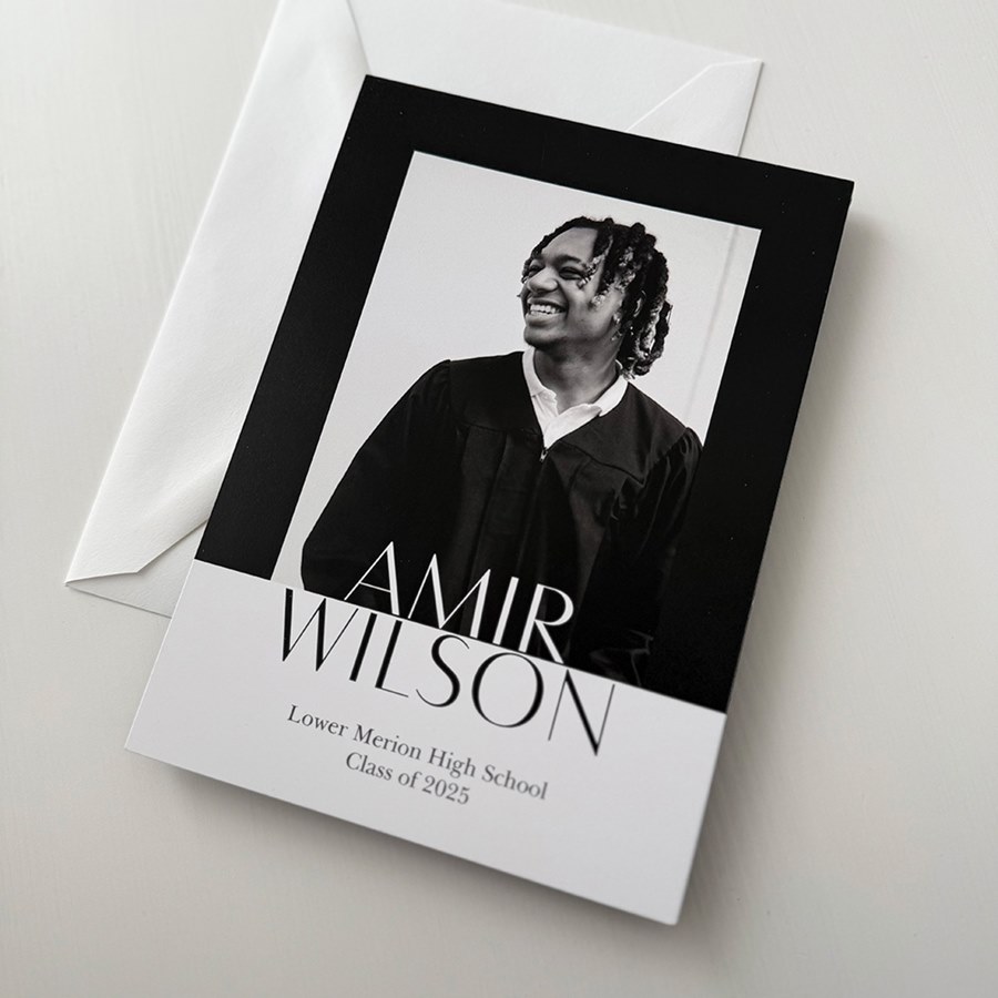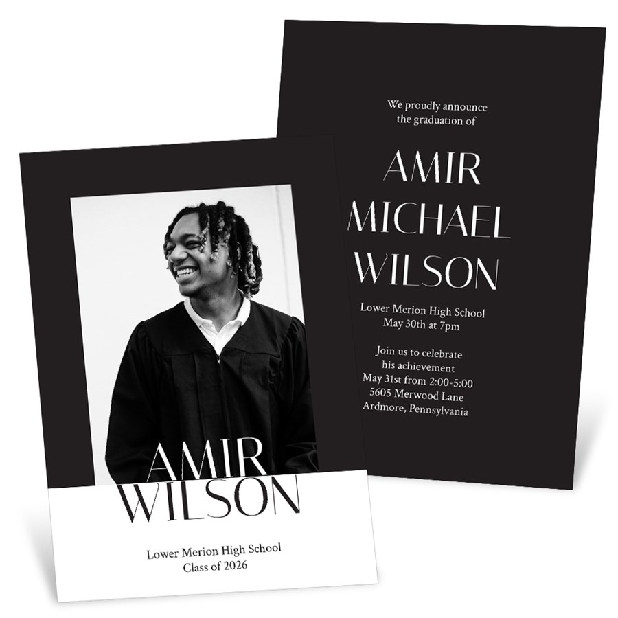 Create a custom graduation announcement that doubles as their grad party invitation. This Split Name Graduation Announcement features their name, in any font and color you'd like, along with custom colors and your favorite photo. Flip it over to the back and choose from several different layout options, more than 10 background patterns or more than 80 solid colors. Your graduation party wording is printed in your choice of colors and fonts.