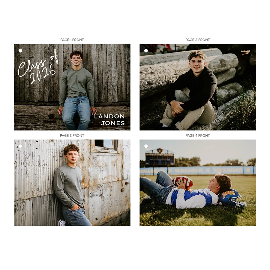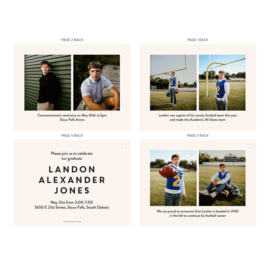 Announce their graduation in modern style with an announcement that's one-of-a-kind. This In the Corner, four-page booklet style swatch book is absolutely stunning. The front card features their graduation year printed in the color of your choice. You can move this wording to fit your photo best. The front and backside of each card features a photo as well as your personalized text. You can update all editable fonts and colors to create a look that's completely customized. The four cards on this booklet style graduation announcement are held together by a silver metal grommet in the top left corner.