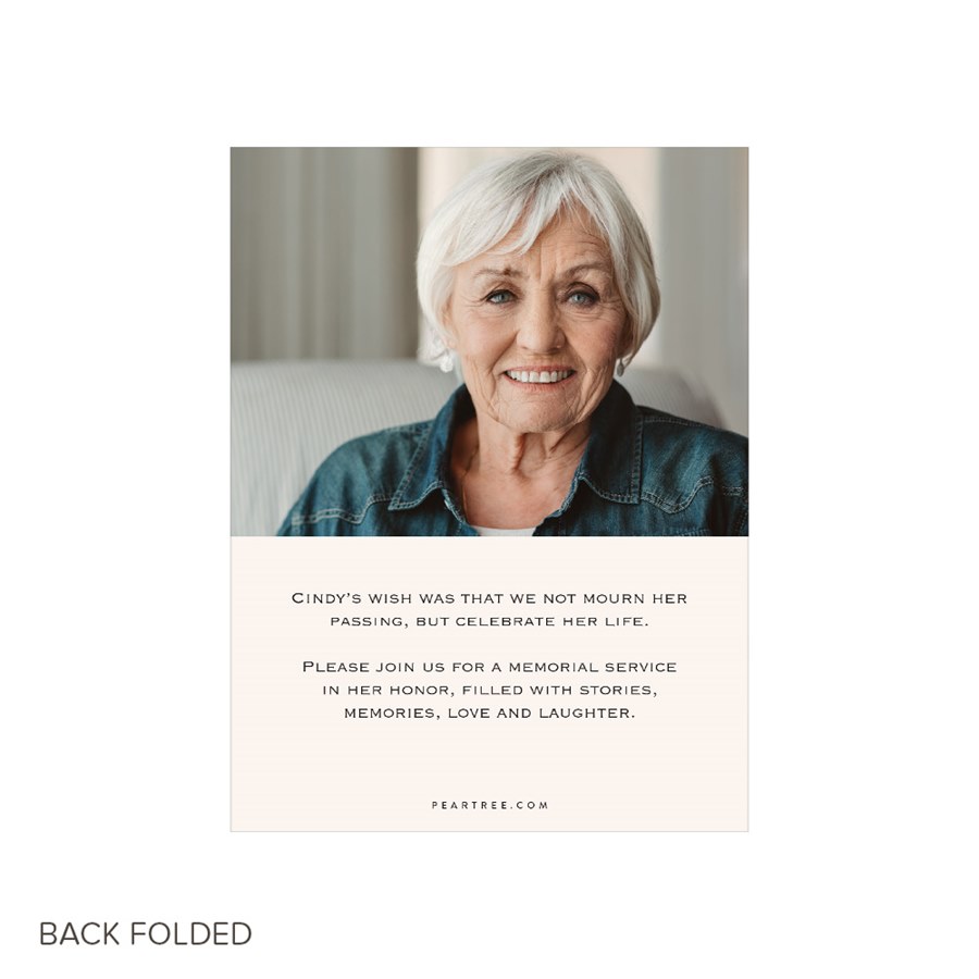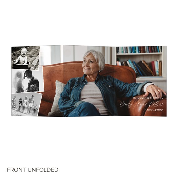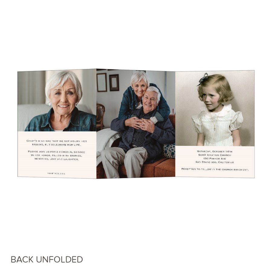 This Layered Photos trifold Memorial Card lets you share photos and memories in sweet style. Add 4 pictures to the front, then update the colors and text to create a custom look. You can also change all the text to add passages, quotes, bibles verses and more. The back features 3 additional photos that are perfect for sharing photos from throughout your loved one's life.