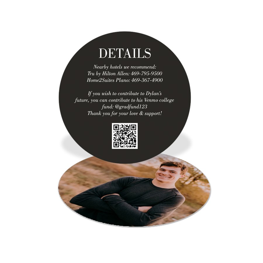 Make celebrating your graduate even more fun with the Block Details Graduation Insert Card. This mini card can fully customized to suit your needs – whether it's sharing commencement or graduation party information, the graduate's Venmo or Cash App for easy gifting (as shown), future plans, or anything you can think of! All wording, colors, and fonts on this card can be customized to match the style of your graduation announcement.