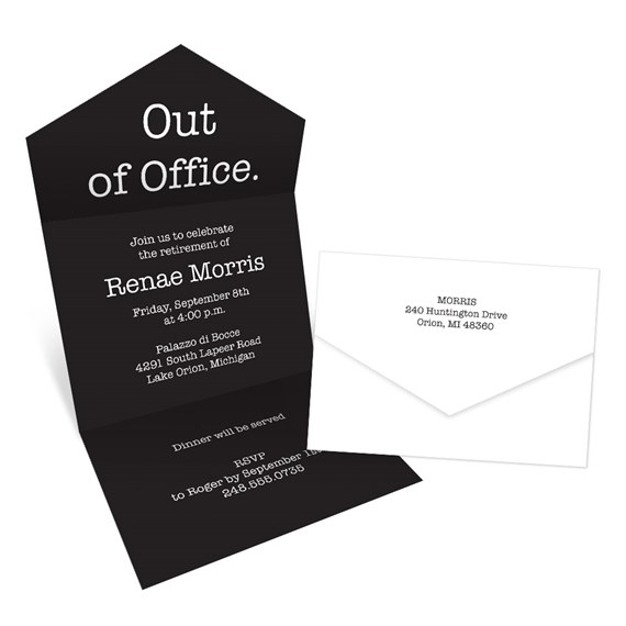 This all-in-one Out of Office Retirement Party Invitation includes your custom party details to celebrate all their years of service. You may update all the text with any font or color. Seal and Sends are self-mailing – no need for envelopes! Simply fold, secure it with clear seals (included) and drop it in the mail.