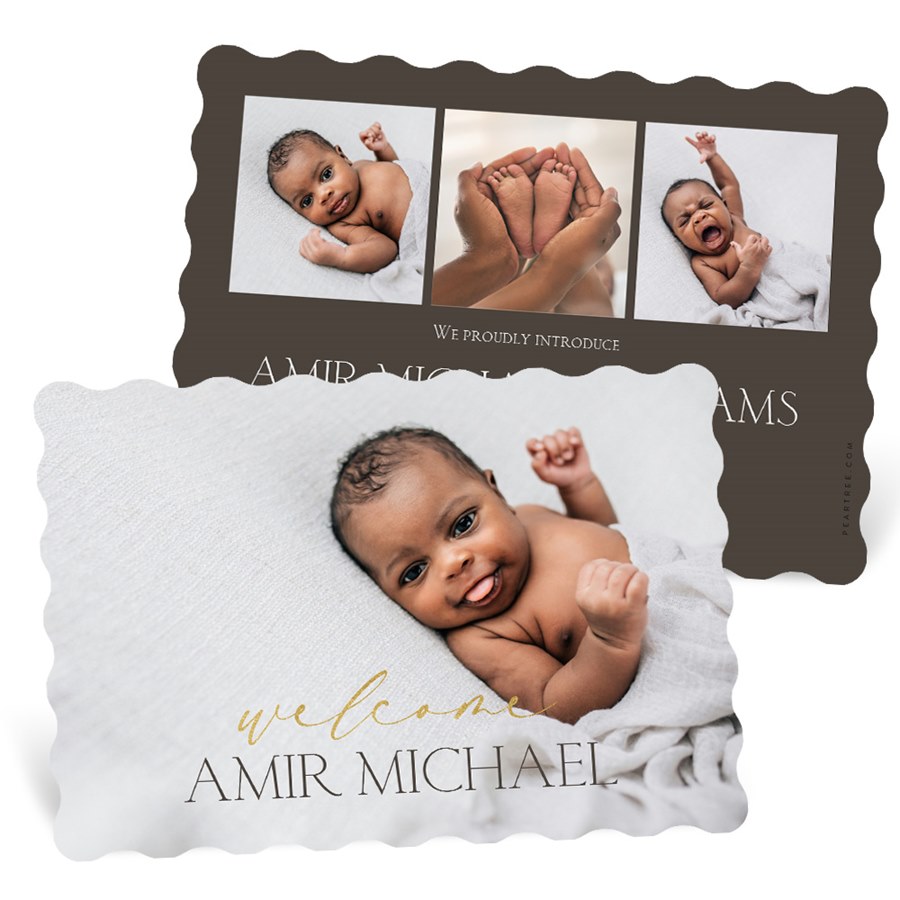 Welcome your little one in shimmering style with this foil-stamped Welcome Baby Birth Announcement. Featuring your favorite photo on the front, accented by the word "welcome" in your choice of foil color, this design is as special as your new arrival. A charming scalloped border adds a sweet touch, while customizable text, colors, and layout options let you create a truly unique announcement to share your joy.
