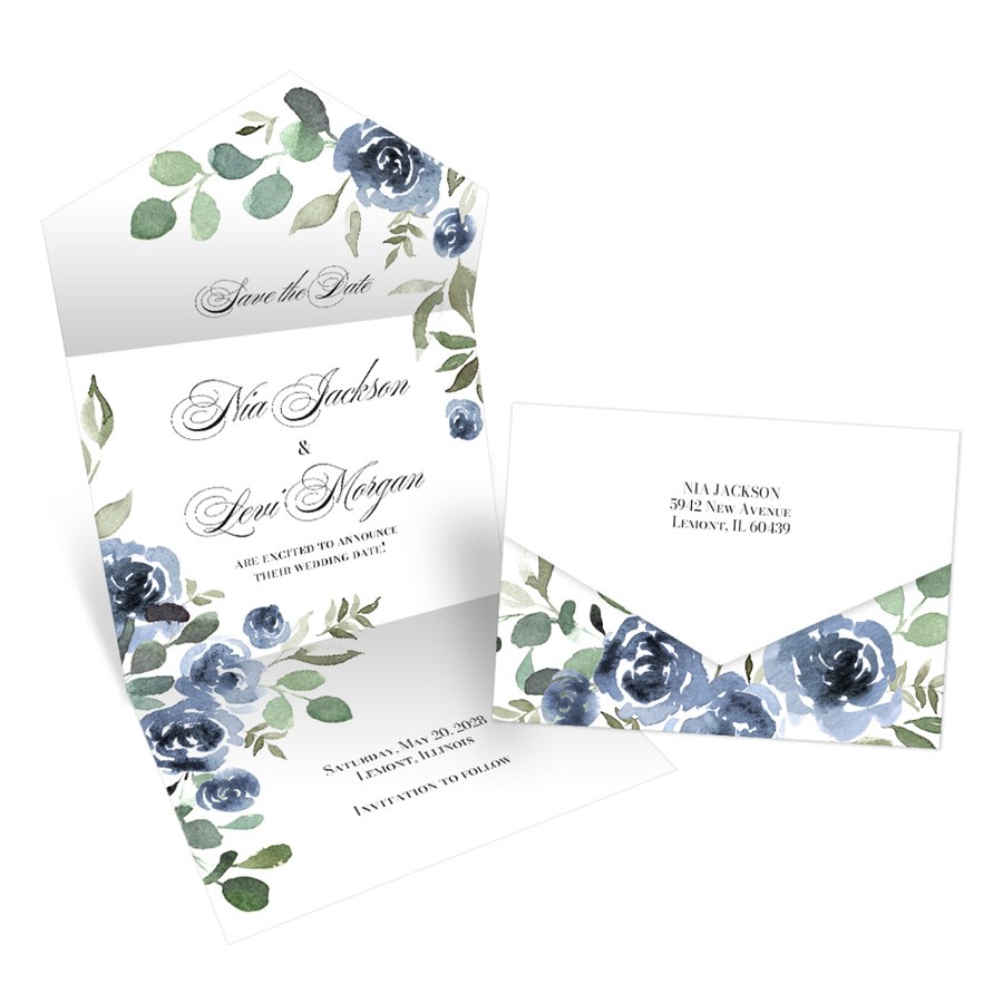 This Blue Roses save the date features beautiful watercolor roses in a shade of dusty blue. As pretty as it is affordable, you can customize all the wording, and update the fonts and text colors to suit your style. Your return address is printed on the outer flap for a polished look.