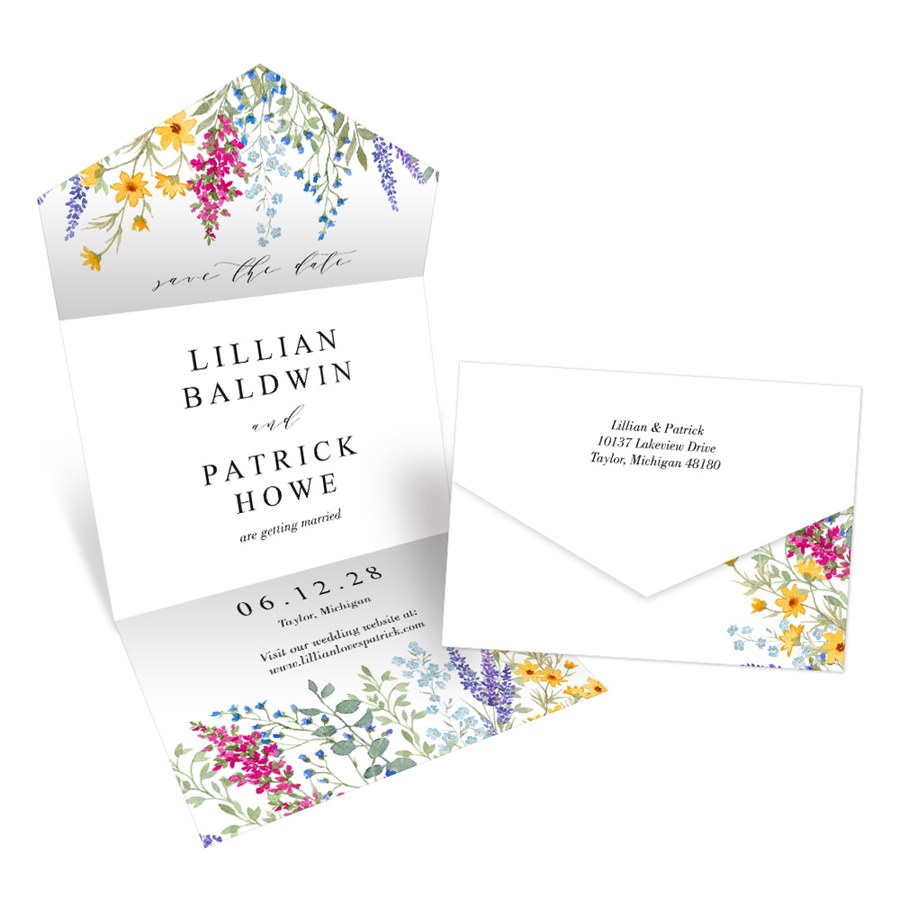 Colorful floral style is yours, and it's affordable too! This Bright Blooms save the date features bright and colorful blooms in shades of purple, blue, green, pink and yellow. You may update the fonts and text colors to suit your style. Your return address is printed on the outer flap for a polished look.