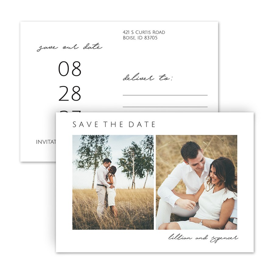 This Lovely Pair save the date postcard features a pair of photos and chic styling. You may update the background color and editable text colors to fit your own style. Remember to use postcard-rate stamps to save on postage!