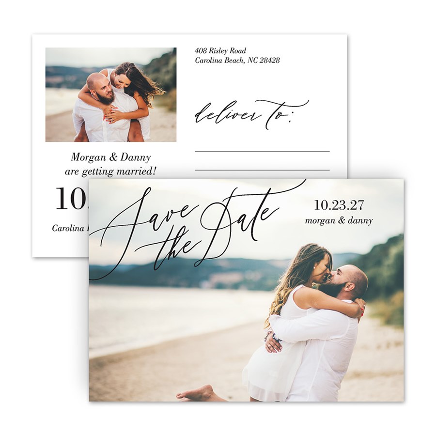 This Simply Elegant save the date postcard has loads of style packed into an affordable card. The phrase "Save the Date" is printed across your photo in the colors of your choice. The editable text can be changed to the wording you'd like in any font and color. Remember to use postcard-rate stamps to save on postage!