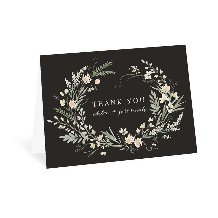These Wrapped in Wildflowers wedding thank you cards feature cream-colored wildflowers. Customize them with any background color of your choice with your personalized wording in the fonts you love most.