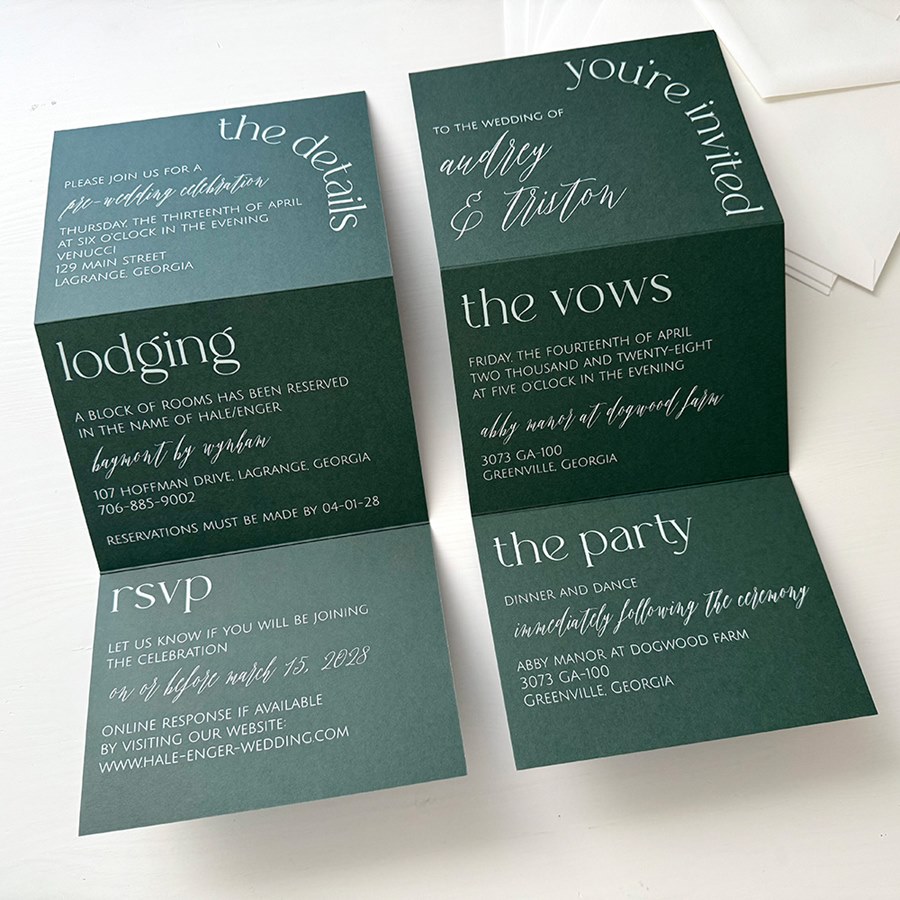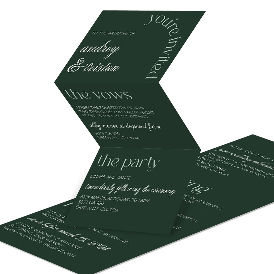 Customizable this folded wedding invitation with your chosen colors, fonts, and personal touches. This trifold invitation is a sophisticated choice for couples who want to make a lasting impression.