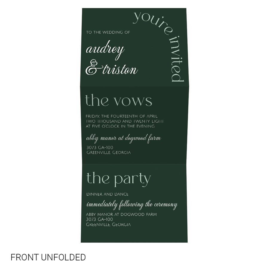 Our Arched Invite Vertical Trifold Wedding Invitation offers a stunning, modern design perfect for sharing every detail of your special day. With three panels, this invitation unfolds to reveal your wedding information in a sleek and organized format. The front features the phrases "you're invited", "the vows", and "the party" that you can customize the color and placement.