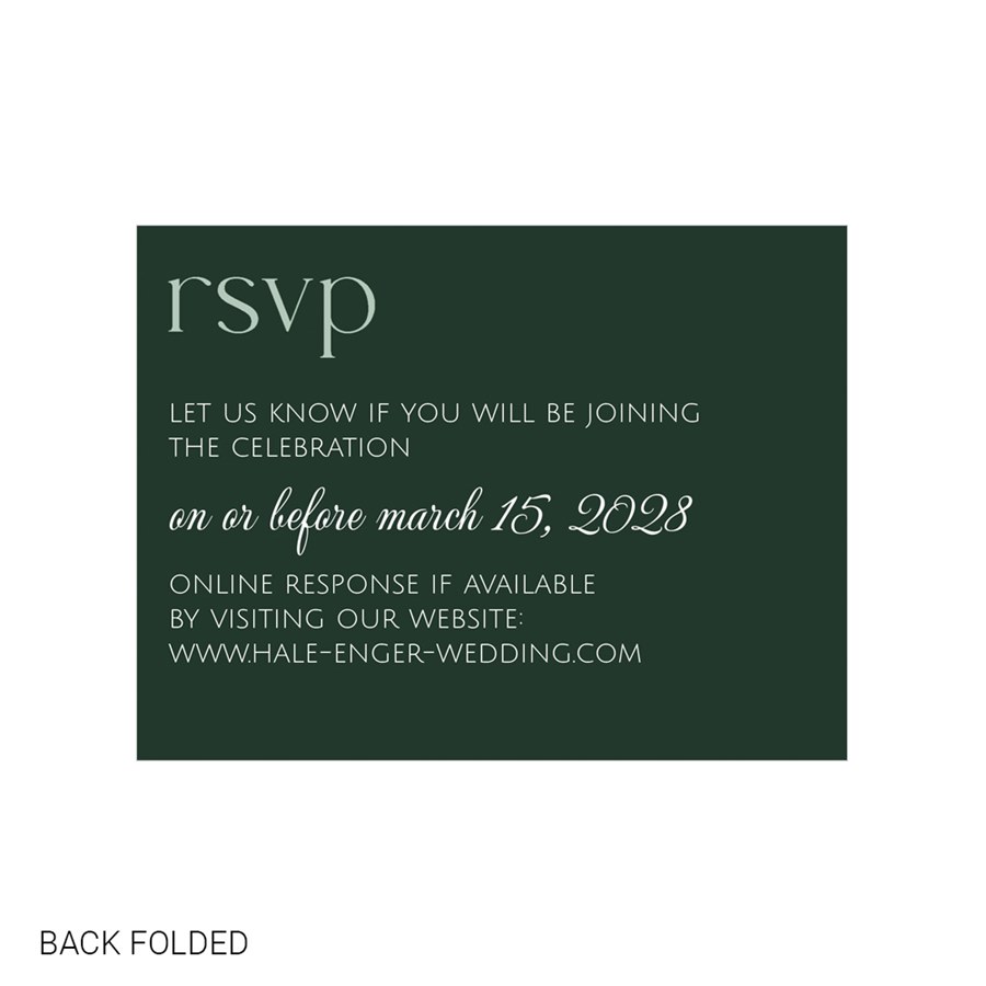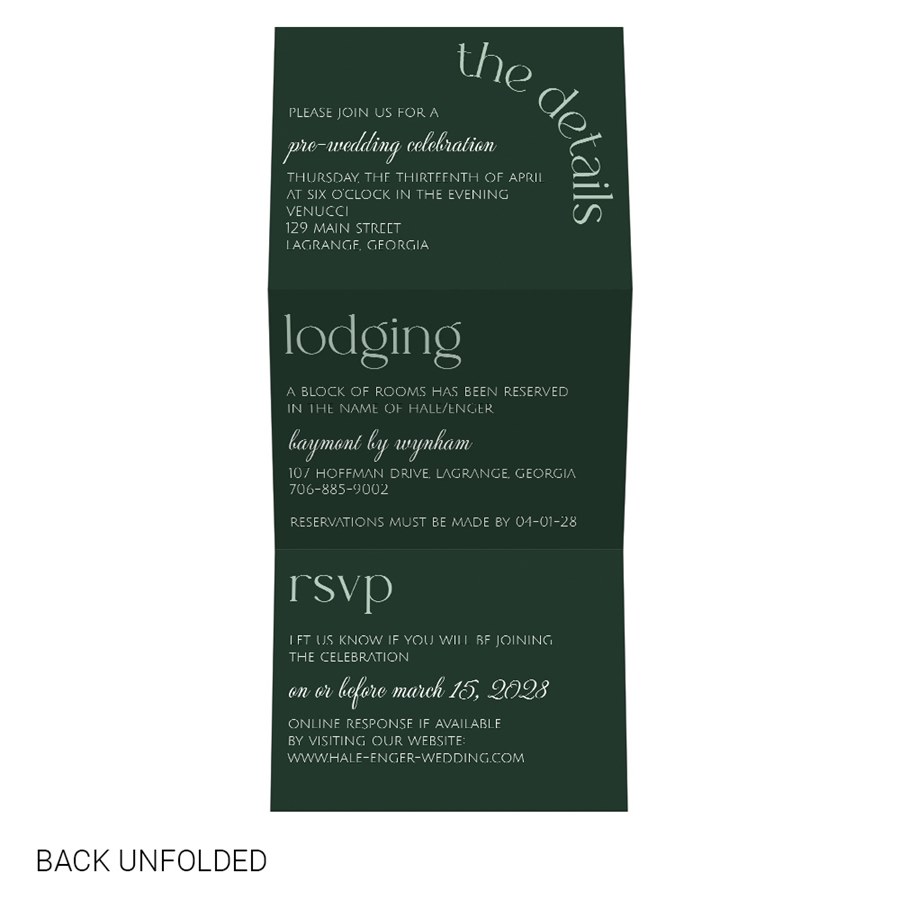 The back side panels provide space for your reception details, lodging information, and RSVP instructions. The phrases "the details", "lodging", and "rsvp" are featured on the back. You can customize the color and placement of the artwork to fit your invitation best.