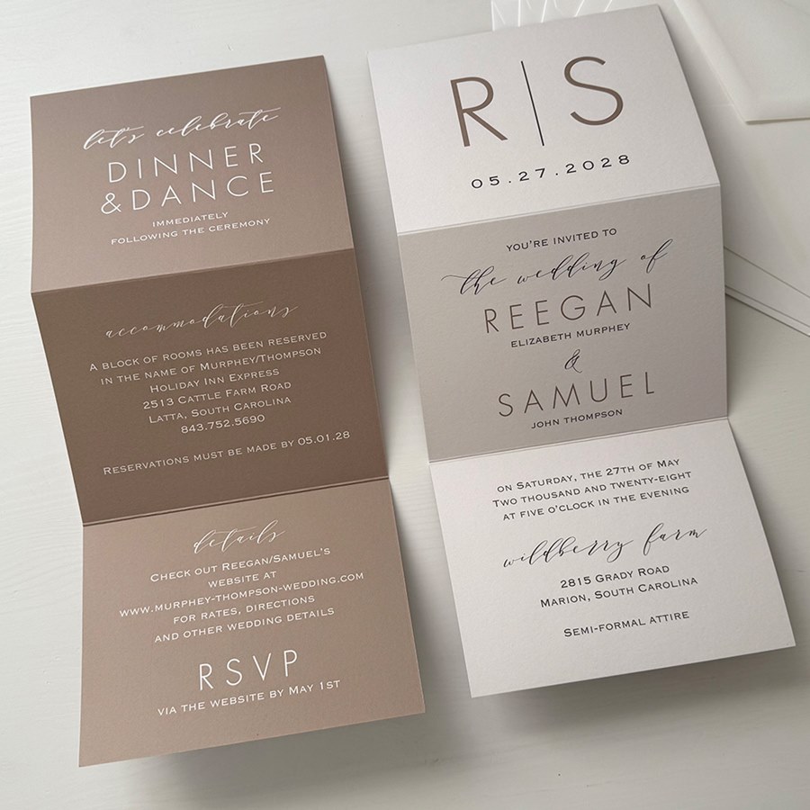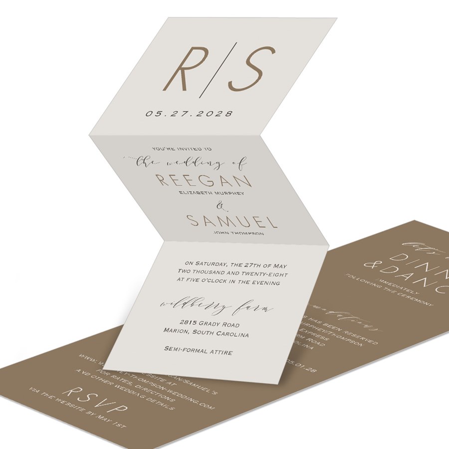 Customizable this folded wedding invitation with your chosen colors, fonts, and personal touches. This trifold invitation is a sophisticated choice for couples who want to make a lasting impression.