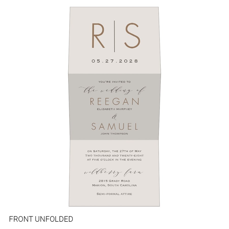 The Details Vertical Trifold Wedding Invitation offers an simple, modern design perfect for sharing every detail of your special day. With three panels, this folded wedding invitation unfolds to reveal your wedding information in a sleek and organized format. The front features your custom invitation text with a modern monogram.