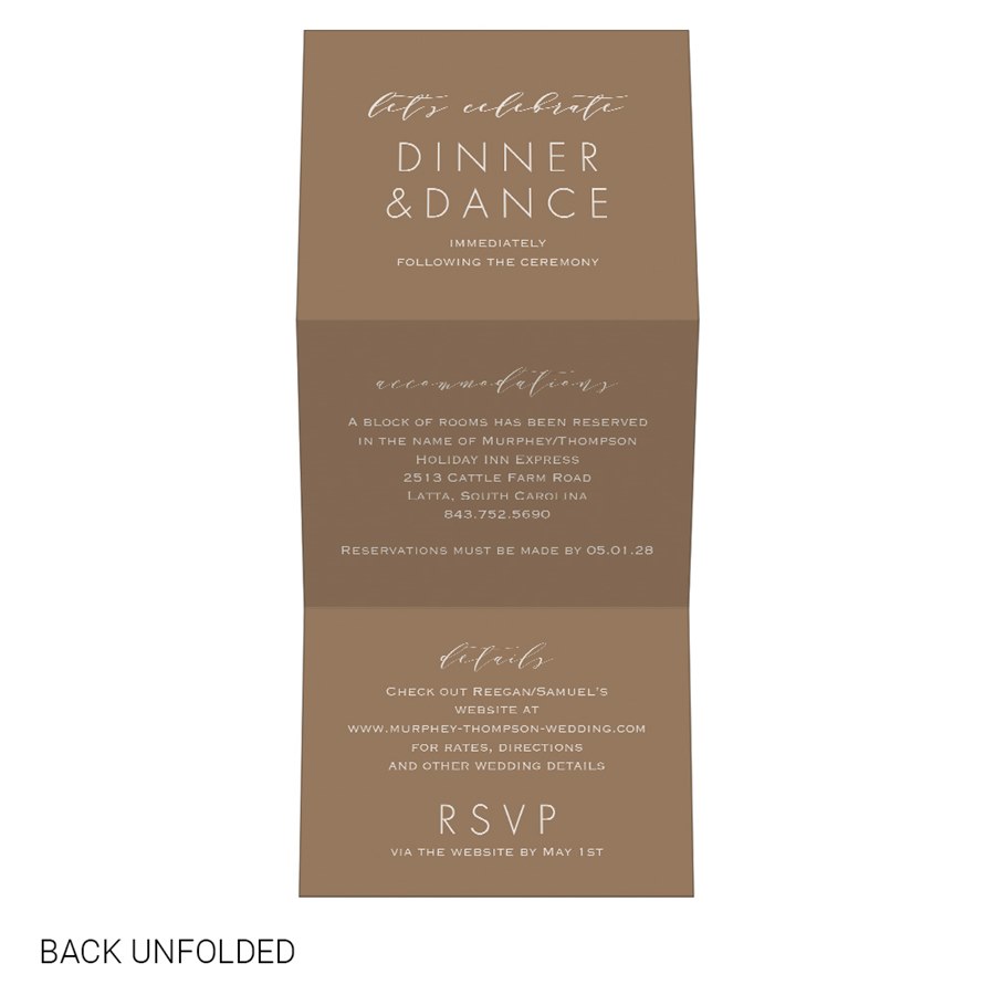 The back side panels provide space for your reception and rsvp information, or whatever you choose to share, along with your choice of background color.