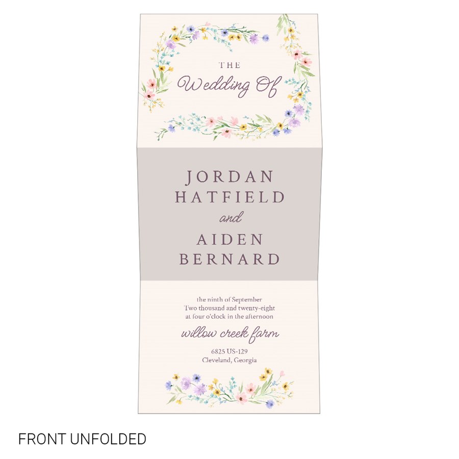 Our Spring Blooms Vertical Trifold Wedding Invitation offers a boho, floral design perfect for sharing every detail of your special day. With three elegant panels, this folded wedding invitation unfolds to reveal your wedding information in a sleek and organized format. The front features wildflowers in a colorful palette. It can be customized in any background color with the fonts and wording of your choice.
