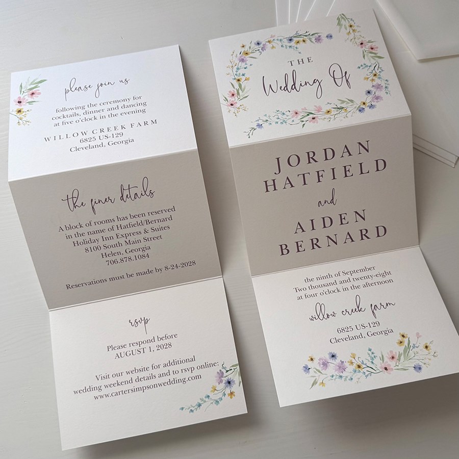 Customizable this folded wedding invitation with your chosen colors, fonts, and personal touches. This trifold invitation is a sophisticated choice for couples who want to make a lasting impression.