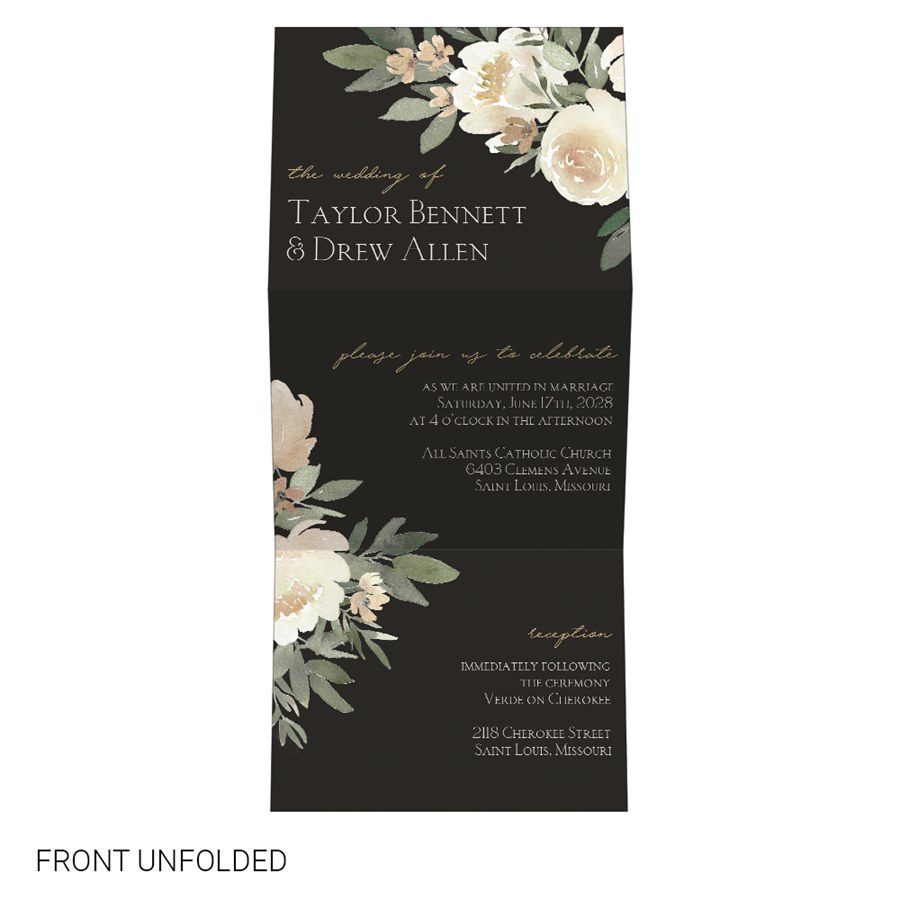 Our Bold Blooms Vertical Trifold Wedding Invitation offers a beautiful, floral design perfect for sharing every detail of your special day. With three elegant panels, this folded wedding invitation unfolds to reveal your wedding information in a sleek and organized format. The front features cream blooms with greenery accents. It can be customized in any background color with the fonts and wording of your choice.