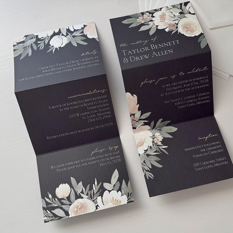 Customizable this folded wedding invitation with your chosen colors, fonts, and personal touches. This trifold invitation is a sophisticated choice for couples who want to make a lasting impression.