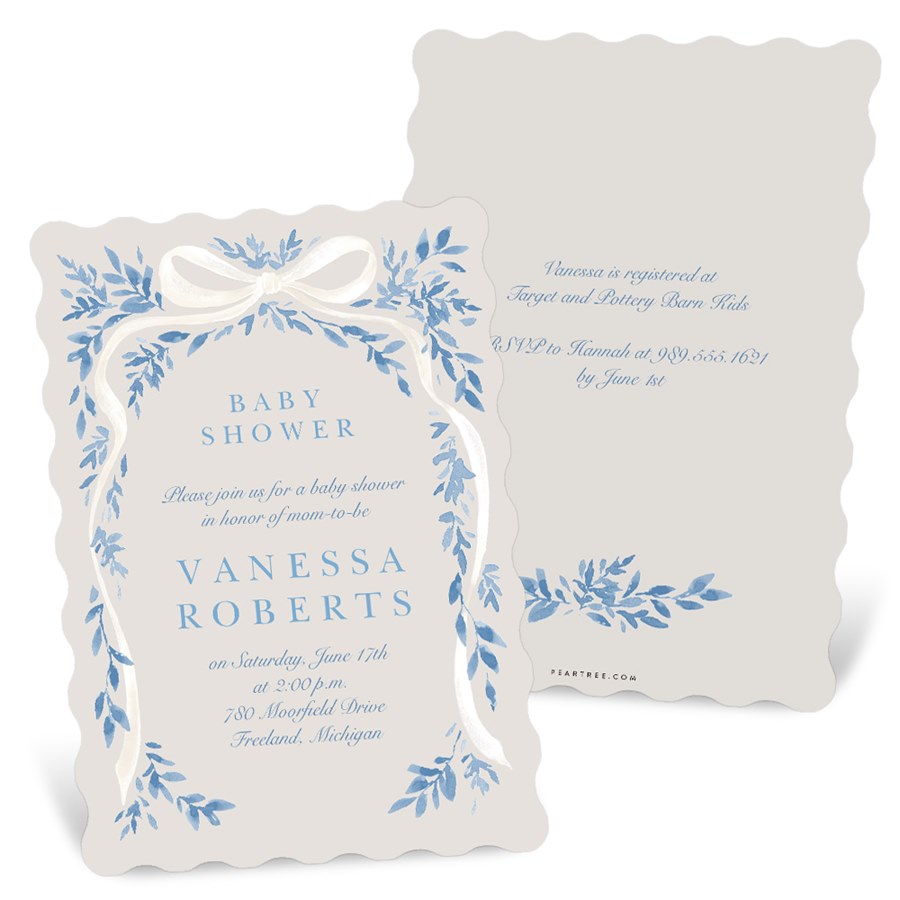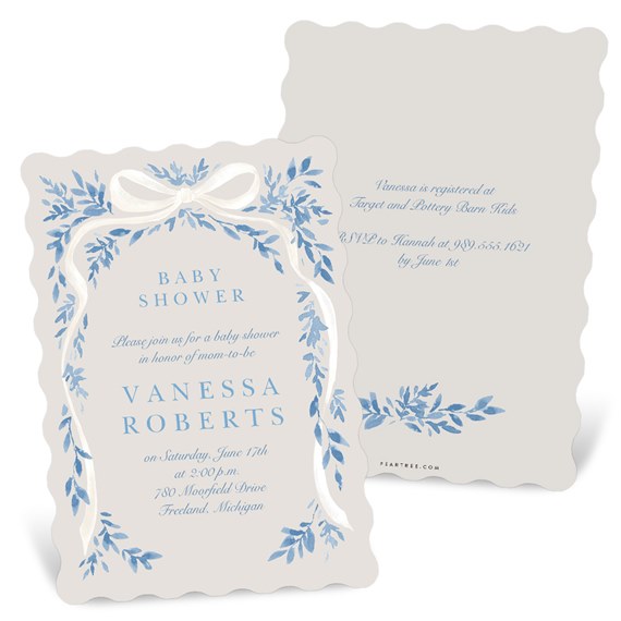 Celebrate your little one’s happily ever after with these Fairy Tale Baby Shower Invitations. The two-sided design features a sweet scalloped trim, customizable background and greenery colors, and an elegant white ribbon bow that adds a touch of magic.