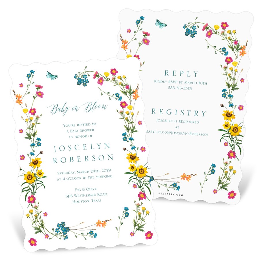 Delight guests with this sweet Whimsical Floral baby shower invitation featuring wildflowers, butterflies, and a scalloped trim. Colors are printed as shown for a perfectly polished look that’s ready to mail.