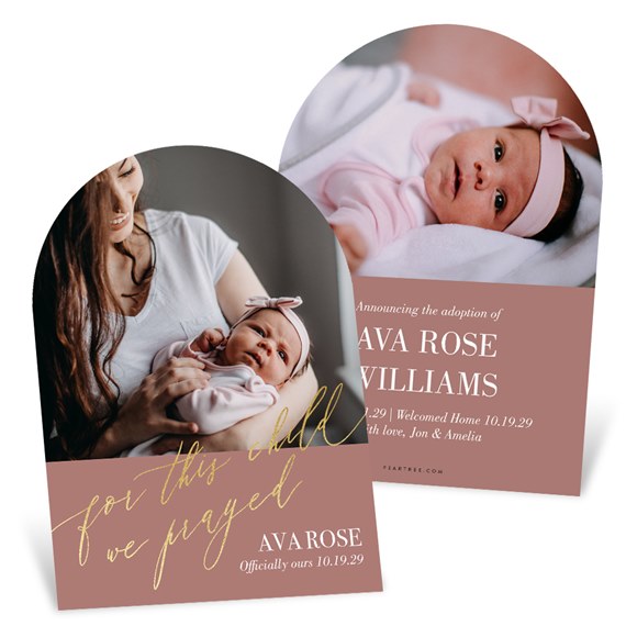 Celebrate your little miracle with the We Prayed Adoption Announcement, elegantly foil-stamped for a touch of shimmer. Showcasing your favorite photo on the front with the heartfelt phrase "For this child we prayed" in your choice of foil color, this announcement is as meaningful as it is beautiful. The modern arched die-cut shape adds a sophisticated touch, while customizable text, colors, and layouts let you create a one-of-a-kind keepsake to share your joy.