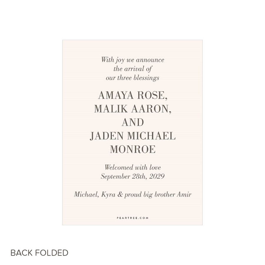 Share your exciting news in style with the Triplet Basics Triplets Birth Announcement—a beautifully unique folding design made to celebrate your trio. The front features three adorable photo spots to introduce each baby, along with your custom wording and birth details. Choose any background color to match your personal style.