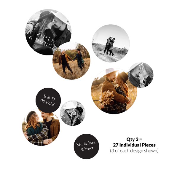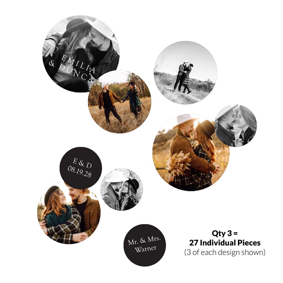 Jumbo table confetti is sold in sets of 3, with each set containing 9-pieces of custom confetti. A quantity of three equals 27 total confetti pieces, a quantity of 6 equals 54 confetti pieces, etc.