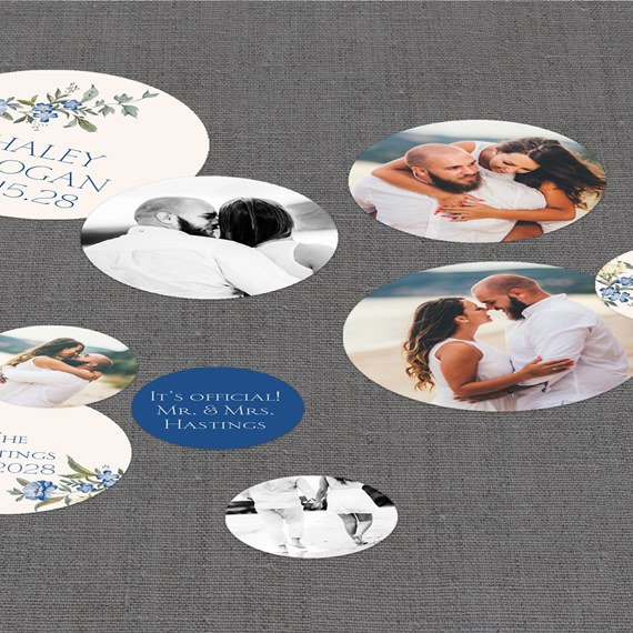 Scatter them on tables, tuck them into centerpieces or create a cute photo bunting banner with them. Personalize them by adding your photos, changing the colors and more.