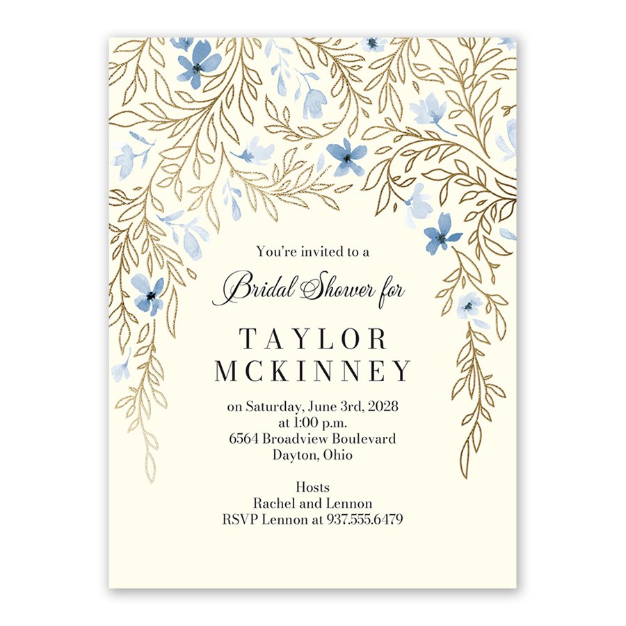 Gorgeous florals and gold greenery accent your bridal shower details in stunning style on this Delicate Blooms bridal shower invitation. You can update the background and blue floral colors to the color of your choice along with the fonts and text colors to suit your style.