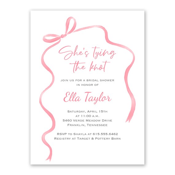 This Blushing Bride, bow-themed bridal shower invitation is adorably sophisticated. Add your custom invitation text in any font and color that you choose. You can update the bow and background colors. The words "She's tying the knot" is printed on the front in the color of your choice. You can move the placement of the wording to fit your card best. Perfect for the bride-to-be!