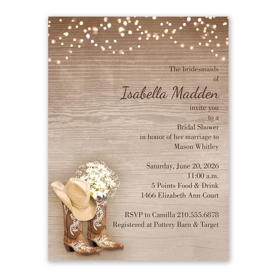 This country-western themed, Western Chic bridal shower invitation is perfect for a country bride! It features a woodgrain background, twinkling lights and cowgirl boots topped with daisies and a cowgirl hat. Perfect for a gal who's having a western themed wedding, this affordable invite has such a fun theme.