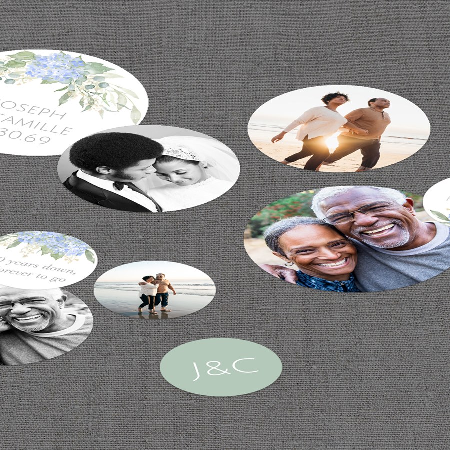 Scatter them on tables, tuck them into centerpieces or create a cute photo bunting banner with them. Personalize them by adding your photos, changing the colors and more.